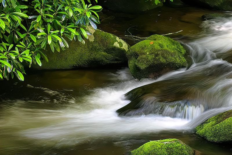 Nice silky water and the contrast with the bright green of the leaves and moss. Well done.